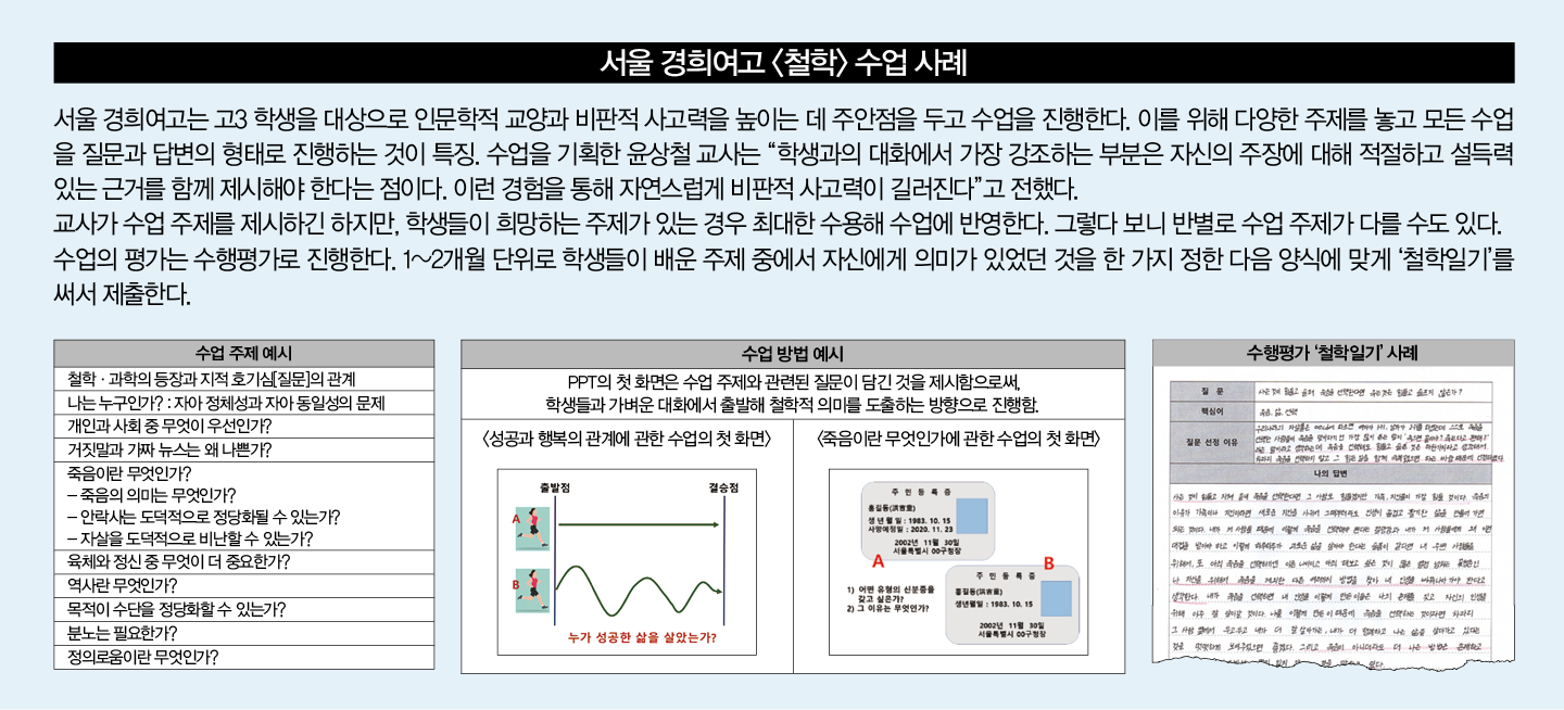 <철학> 교육과정은 철학적 ‘지식’을 암기하기보다는 ‘학생 스스로 철학함’을 통해 자유로운 자기 정체성을 확립하도록 하는 과목이다. 서울 경희여고 윤상철 교사는 “궁극적인 문제들을 찾아 비판적·총체적·창의적 탐구 능력을 통해 학생 나름대로 답을 찾아보는 경험이 중요하다. 일련의 과정 속에서 표현과 소통 능력을 향상시켜 그 답이 보편성을 갖도록 하는 것이 <철학> 수업의 핵심”이라고 강조했다.