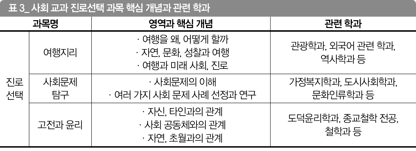 진로선택 과목으로는 <여행지리> <사회문제탐구> <고전과 윤리>가 있다. 학교 사정에 따라 주로 2~3학년에 걸쳐 배운다. 한 학교 안에 수업을 개설하기도 하지만, 신청 인원이 적을 경우 온라인 공동 교육과정이나 여러 학교를 묶어 수업하는 거점 학교 프로그램 형태로 진행하기도 한다.