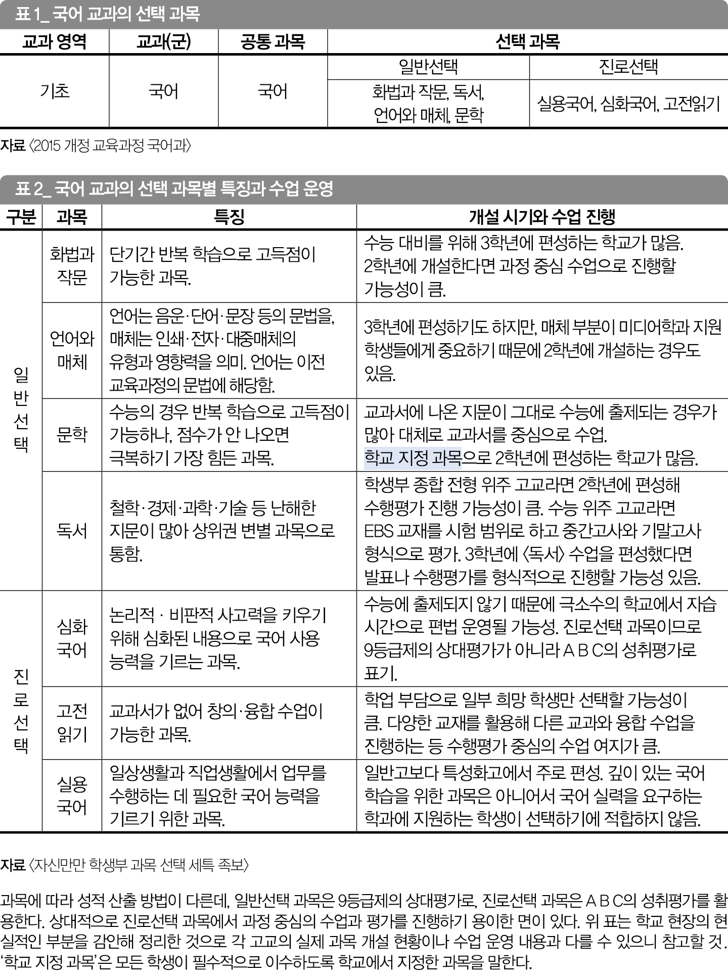 국어 교과는 공통 과목인 <국어>와 각 영역에 대해 심화 성격을 지닌 일반선택 과목 <화법과 작문> <독서> <언어와 매체> <문학>이 있고, 진로선택 과목으로 <실용국어> <심화국어> <고전읽기>가 있다. 서울 상계고 조남주 교사는 “국어 교과는 일반선택 과목과 진로선택 과목 간에 명확한 위계가 있진 않다. 다만 <심화국어>는 수준 높은 국어 능력을 통해 학문 활동을 하는 데 필요한 전문성과 문제 해결 능력을 기르는 데 적합한 과목이기 때문에 3학년 과정에 편성할 것을 권장한다”고 설명했다. 특성화고의 경우에는 <실용국어>를 공통 과목인 <국어> 이전에 배울 수도 있다. <고전읽기>는 별도의 교과서가 없는 과목으로 교육과정상의 성취 기준을 토대로 각 고교 상황에 따라 2학년 또는 3학년에 개설할 수 있다. 일반적으로 고1 때는 모든 학생이 이수하는 공통 과목 <국어>를 배우고 2·3학년 때 학생의 희망에 따라 공부하고 싶은 과목을 선택한다.