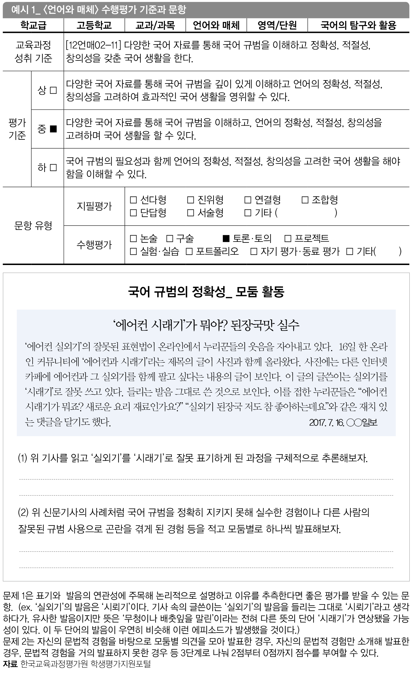 예시 1은 ‘다양한 국어 자료를 통해 국어 규범을 이해하고 정확성 적절성 창의성을 갖춘 국어 생활을 한다’는 성취 기준에 근거해 개발한 <언어와 매체> 수업의 수행평가 문항이다. 이 문항은 성취기준에서 제시한 것처럼 다양한 국어 자료를 통해 국어 규범을 이해하고 정확성과 적절성을 갖춘 국어 생활을 할 수 있는지를 평가하기 위한 것. 문법 실수를 소재로 한 신문기사, 광고 문구, 국어 규범 해설 자료 등을 읽기 자료로 제시했고, 학생들이 이를 비판적으로 검토해 자신의 국어 생활을 성찰할 수 있도록 했다.