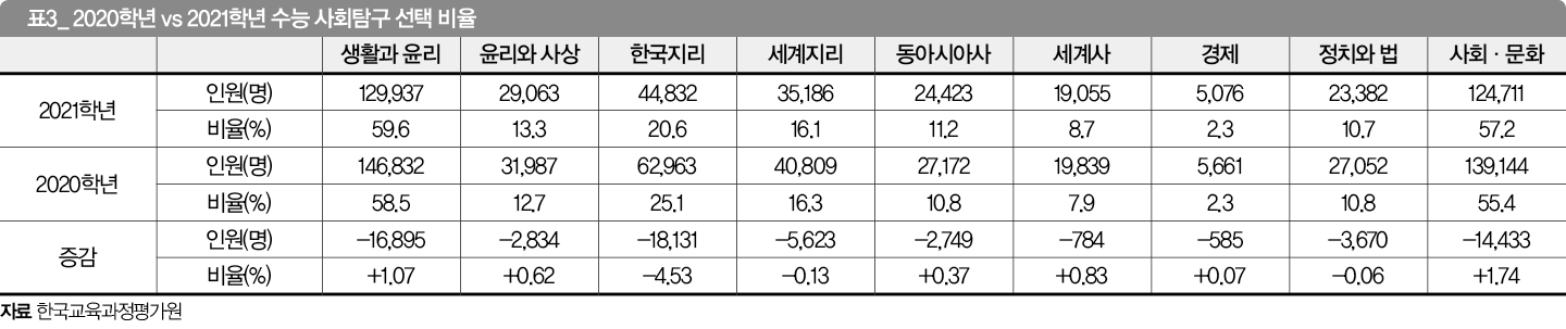 경남 남해해성고 이동하 교사는 “학생들의 선택이 가장 많은 <생활과 윤리> <사회·문화>는 개념이 비교적 쉽다는 인식과, 암기나 학습량이 다른 과목에 비해 적고, 지문 해석을 통해 문제를 해결하기가 다른 과목에 비해 쉽다는 점, 응시 인원이 많아 상대적으로 등급 받기가 용이한 점 등 때문에 앞으로도 계속 높은 응시율을 유지할 것으로 예상된다. 두드러진 변화는 그동안 응시율 20% 중반대를 유지하던 <한국지리>가 지난 수능에서 응시 인원이 크게 줄었다는 점이다. 이과적 역량이 뛰어난 학생들에게 유리한 그래프와 통계적 분석이 필요한 문항이 <한국지리>에 출제되는데, 이 때문에 갈수록 응시율이 떨어지고 있는 것으로 보인다”고 풀이했다.