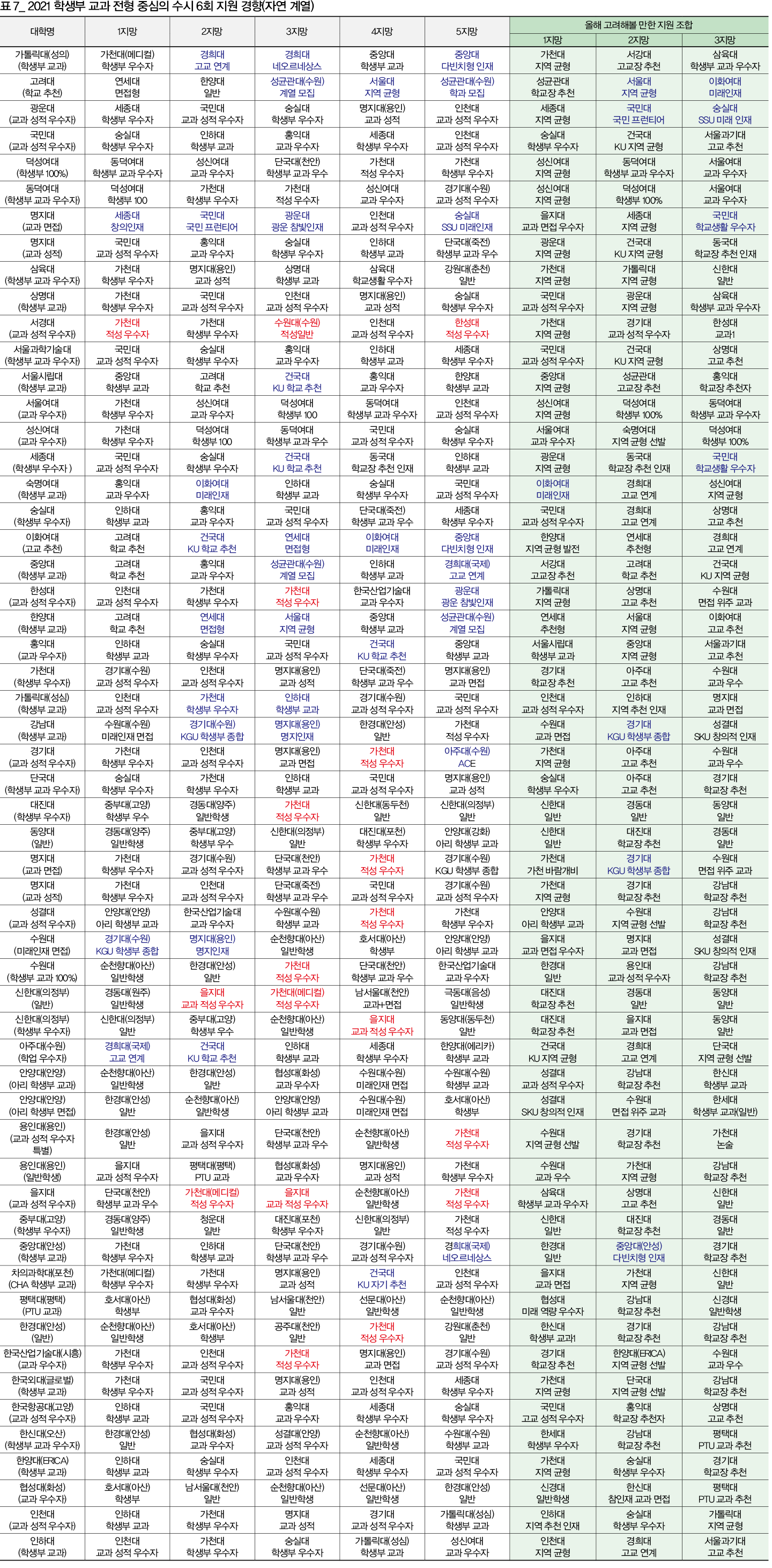 학생부 교과 전형을 중심으로 지원했던 학생들이 수시 원서 6장을 어떻게 구성했는지 경기도 학생들의 2021학년 지원 패턴을 기준으로 정리했다. 이에 더해 올 수시에서 고려해볼 만한 대학 및 전형을 추가했다. 2021학년 지원 패턴을 분석해보면 교과 전형을 중심으로 지원한 학생들은 학생부 종합 전형에도 적극적으로 지원하는 모습을 보였다. 단, 특정 지역 학생들을 대상으로 한 자료이기 때문에 중하위권 대학으로 갈수록 통학거리 중심의 지원 패턴이 나타났다는 점을 고려해야 한다.