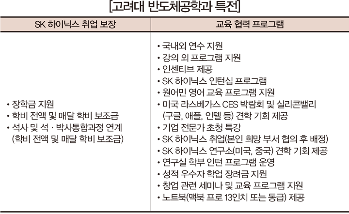 반면 고려대 반도체공학과에 합격한 학생은 학업에 열중하기만 하면 SK 하이닉스 취업을 보장받을 수 있다. 본인의 희망에 따라 학부 졸업 후 SK 하이닉스에 취업하거나 석사 또는 석·박사통합과정에 지원할 수 있다. 대학원 연계 과정을 선택할 경우 등록금과 보조금을 계속 지원받을 수 있으며, 졸업 후에는 SK 하이닉스에 바로 취업할 수 있다.