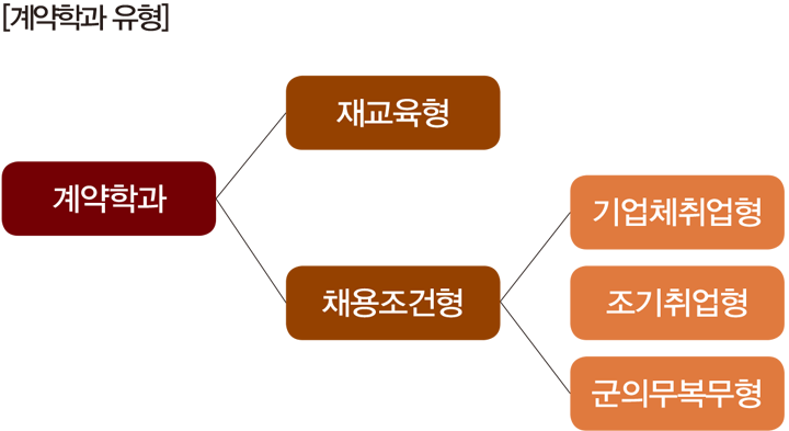 계약학과는 크게 ‘재교육형’과 ‘채용 조건형’으로 나뉜다. 재교육형은 산업체가 소속 직원의 재교육 등을 위해 경비를 부담하며 대학에 필요한 교육과정을 의뢰하는 유형이다. 채용 조건형은 산업체가 고교 졸업(예정)자를 대상으로 필요 경비의 50% 이상을 부담하며 맞춤형 교육과정을 요구하는 경우를 말한다. 이 교육과정을 정상적으로 이수하면 졸업 후 취업이 보장되는 형태로 운영된다. 채용 조건형은 다시 기업체 취업형, 조기 취업형, 군 의무복무형으로 세분화된다. 이 중 고등학생들이 주로 고려할 만한 계약학과는 채용 조건형 중 기업체 취업형, 조기 취업형이다. 군 의무복무형의 경우 ‘전문적 지식과 덕성을 겸비한 육·해·공군의 기술 장교 육성’이라는 선발 목적이 분명하기 때문이다. 기업체 취업형과 조기 취업형을 중심으로 계약학과에 대해 자세히 알아보자.