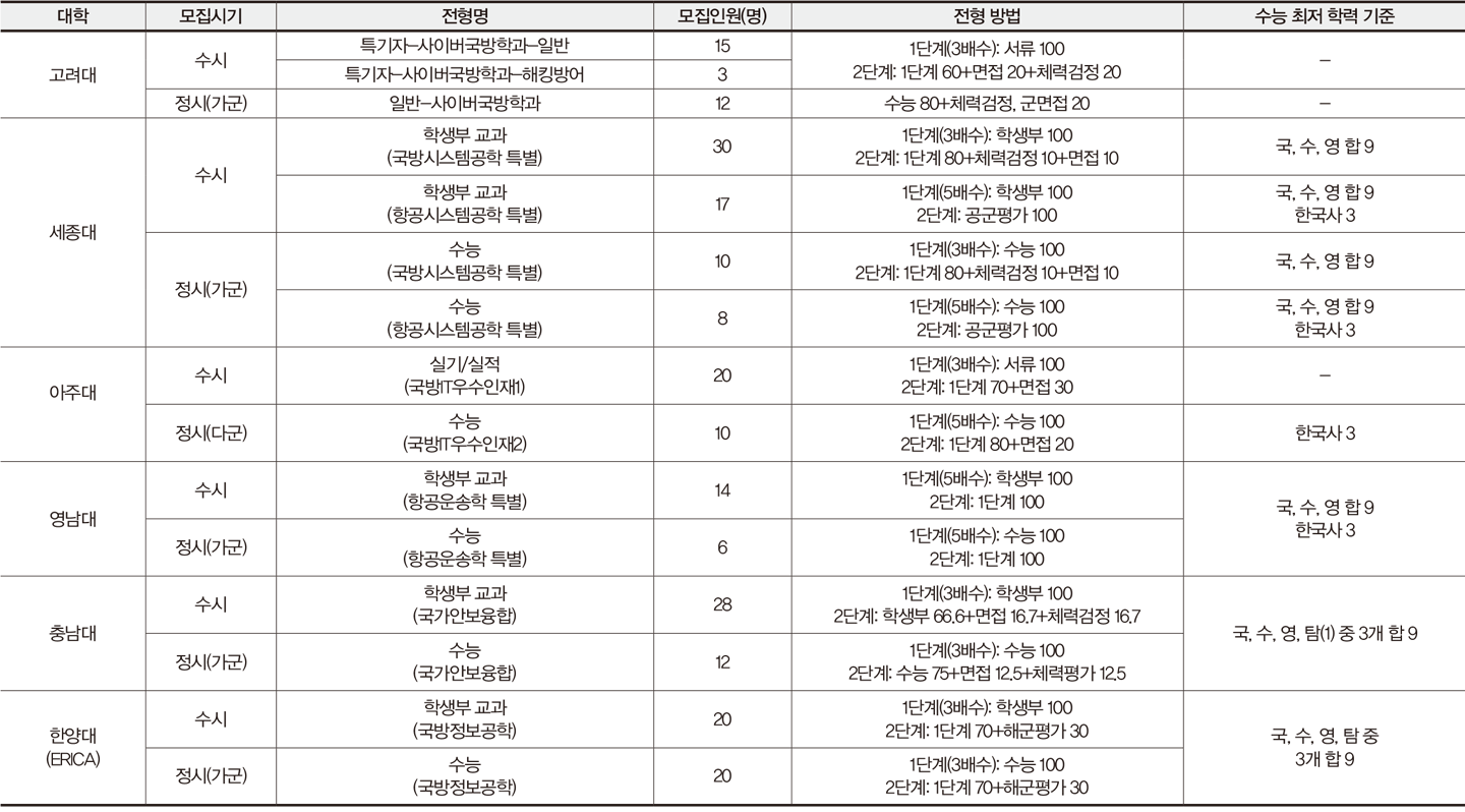| [군 의무복무형 계약학과 선발 대학 및 전형] 군 의무복무형 계약학과 합격생들은 졸업 후 장교로 임관해 육·해·공군에서 첨단 분야와 관련된 업무를 수행한다. 타 대학의 군사학과와 차이가 있다면, 병과가 지정된다 는 것이다. 합격생에게는 대학 졸업 시까지 군 당국이 등록금 전액을 지급하며, 학부 4년과 졸업 후 의무복무 3년을 더해 총 7년간의 의무복무를 해야 한다. 전형 방법 중 체 력 검정과 군 면접이 시행된다는 점도 다른 전형과 차별화되는 특징이다. |