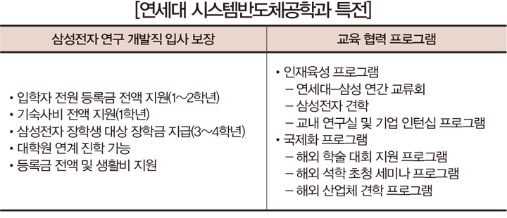 또 2단계 직무적성검사를 위해 GSAT(삼성에서 독자적으로 개발한 직무적성검사)와 SW 역량 테스트도 별도로 준비해야 한다.반면 연세대 시스템반도체공학과는 삼성전자 장학생으로 선발되는 경우 삼성전자 연구 개발직으로 입사가 보장된다. 삼성전자 장학생은 2학년 2학기 재학 중 장학생 선발 채용 절차를 통해 선발된다(불합격 시, 매 학기 재응시 가능).