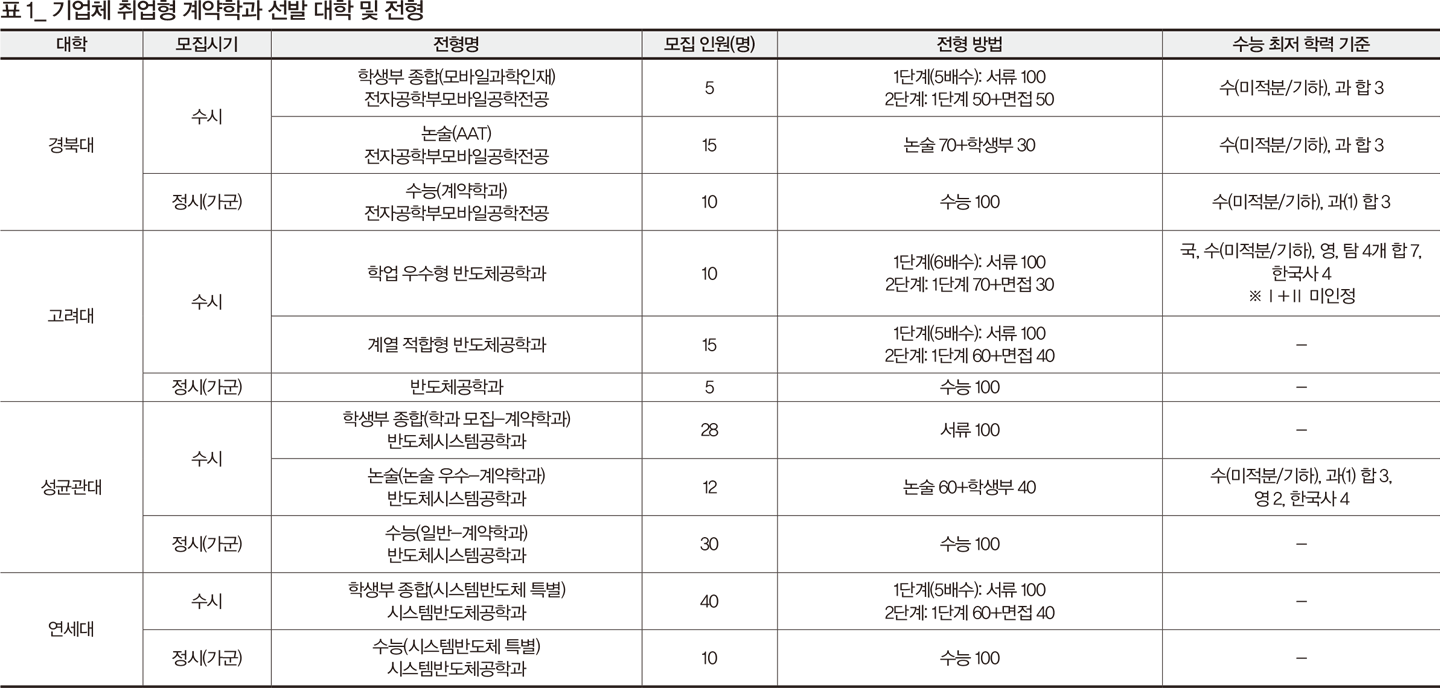 기업체 취업형 계약학과는 대학과 기업 간의 업무 협약을 통해 학과를 졸업하면 해당 기업체에서 근무할 수 있도록 만든 전형이다. 경북대, 고려대, 서경대, 성균관대, 연세대, 한세대에서 학생을 선발하고 있다. 서경대와 한세대를 제외하면 모두 반도체, 모바일 계열의 핵심 인력을 양성하기 위해 설치됐으며, 국내의 대표적인 대기업들과 협약을 맺고 있다(표 1).