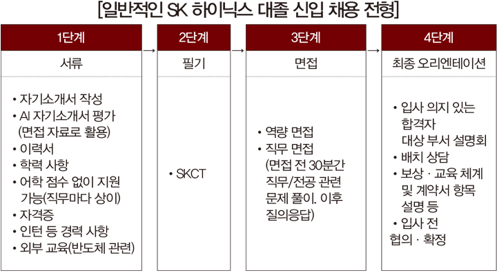 SK 하이닉스의 대졸 신입 채용 전형도 삼성전자의 채용 전형과 유사하다. 차이가 있다면 2021년부터 ‘공채’가 아닌 ‘수시 채용’으로 진행된다는 점이다. 이때 서류 전형은 지원서를 바탕으로 학력 사항, 어학 능력, 모집 분야와의 연관성, 인재상, 핵심 가치와의 부합 등을 기준으로 지원자를 검증한다. 이후 필기 전형인 SKCT(SK종합역량검사)에서는 지원자의 인지 역량, 실행 역량, 심층 역량을 측정한다. 면접 전형은 전공 면접(PT)과 인성 면접으로 진행되며, 최종 오리엔테이션을 통해 면접 합격자에게 설명회를 진행한다.