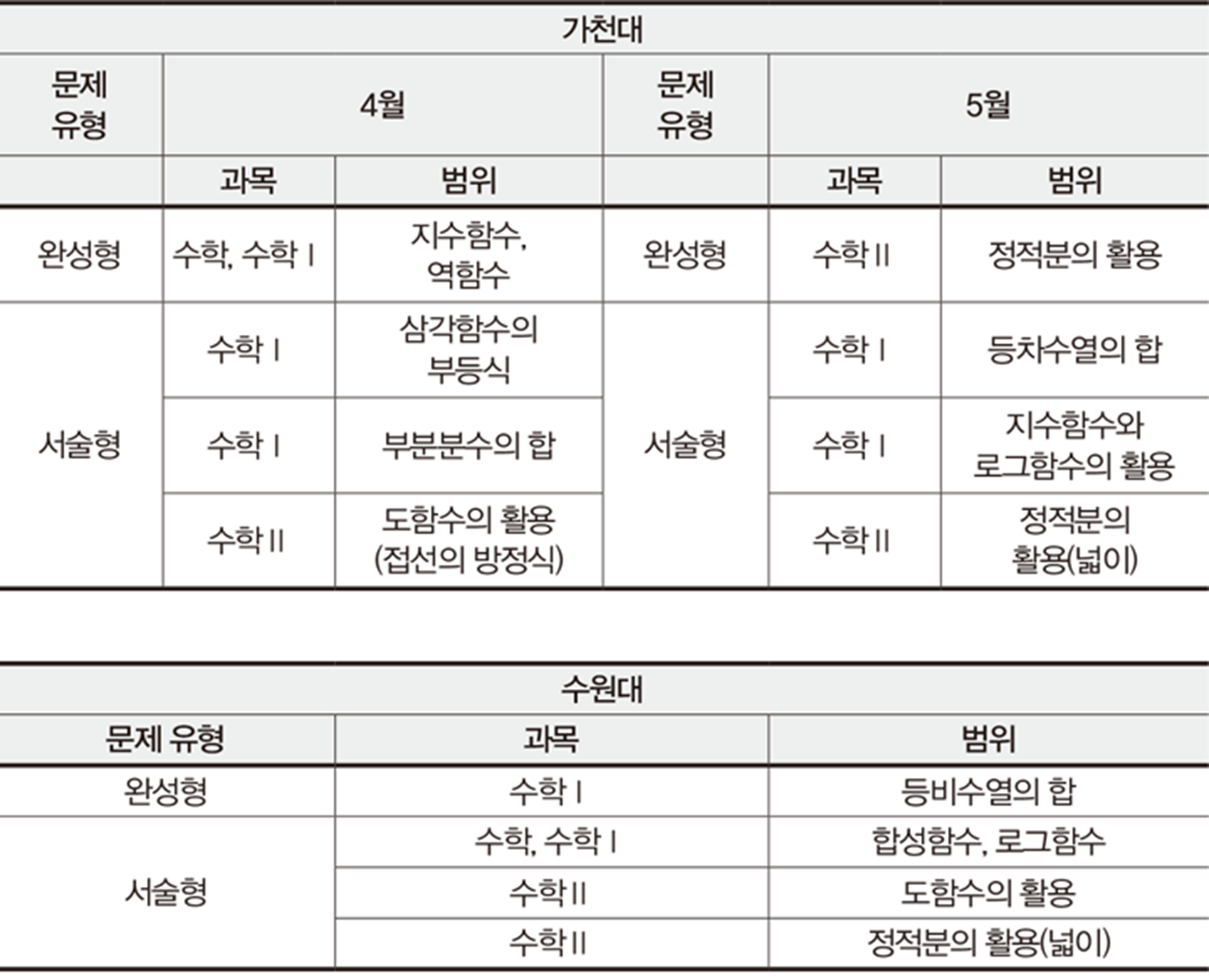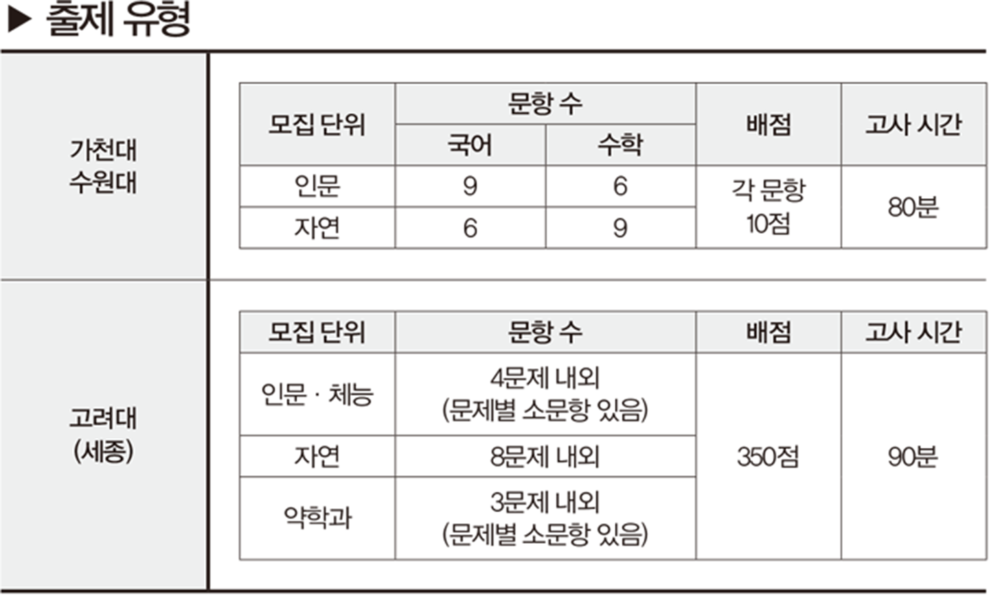 가천대와 수원대는 모집 단위에 따라 인문 계열은 국어 9문항, 수학 6문항을 출제한다. 자연 계열은 국어 6문항, 수학 9문항으로 문항 수에 차이를 뒀다. 배점은 문항 당 10점, 고사 시간은 80분이다. 15문항을 80분 안에 풀어야 하기 때문에 특정 문항에 시간을 쏟기보다 마지막 문제까지 해결한다는 자세로 시험에 임해야 한다. 고려대(세종)은 모집 단위에 따라 문항 수가 다르다. 인문·체능 계열은 4문제 내외이나, 문제별로 소문항이 있다는 점에 주의해야 한다. 자연 계열은 8문제 내외로 소문항은 없으며, 약학과는 3문제 내외로 역시 문제별 소문항이 있다는 점을 고려해야 한다.