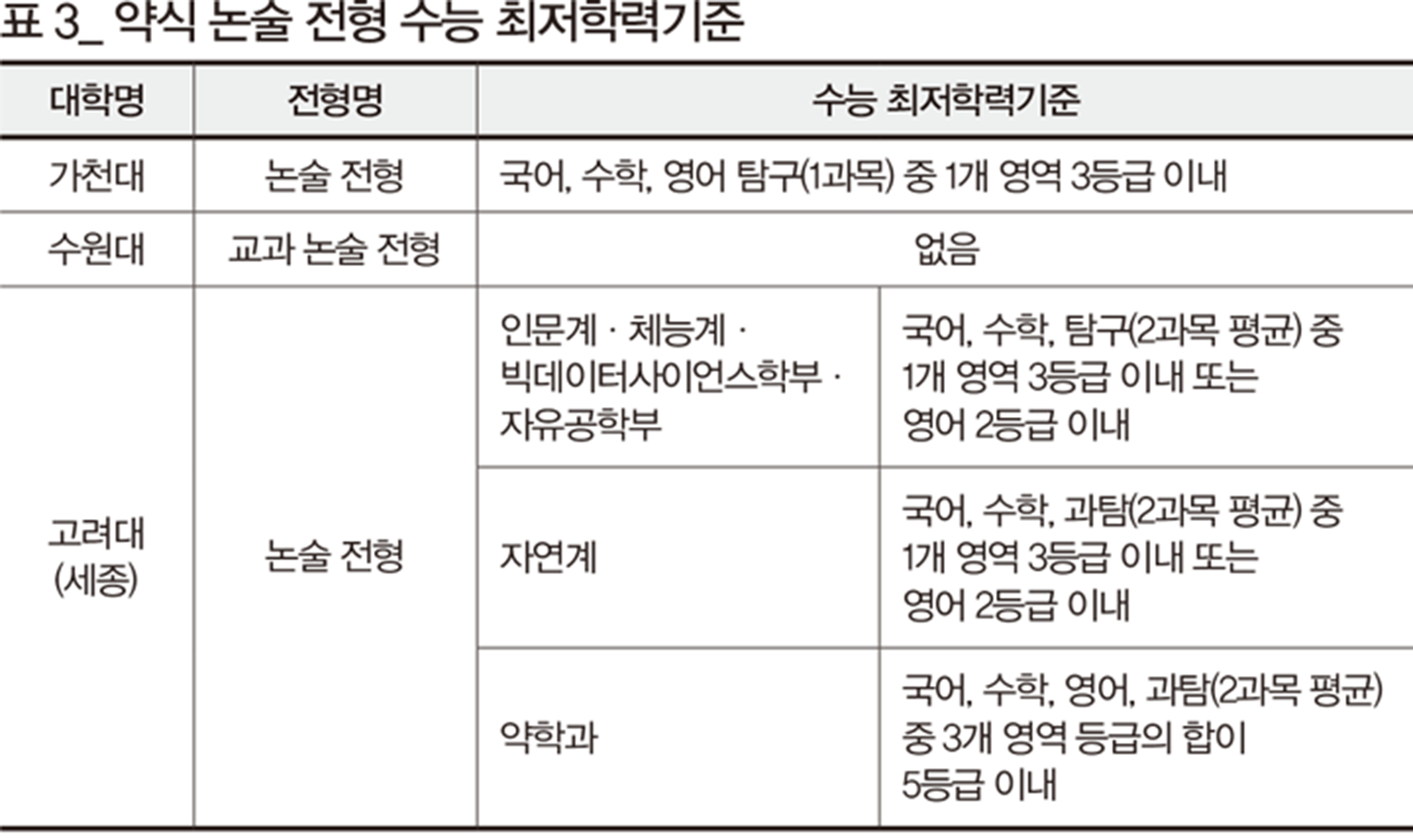 약식 논술 전형 지원 시 우선적으로 고려해야 할 것은 수능 최저학력기준이다. 수원대 교과 논술 전형은 수능 최저학력기준이 없지만, 가천대 논술 전형은 국어, 수학, 영어 탐구(1과목) 중 1개 영역 3등급 이내로 최저 기준을 적용한다. 탐구는 사탐·과탐 구분 없이 한 과목만 반영한다. 그에 반해 고려대(세종)은 모집 단위별로 최저 기준을 제시했다. 인문·체능 계열과 빅데이터사이언스학부·자유공학부는 국어, 수학, 탐구(2과목 평균) 영역 중 1개 영역 3등급 이내 또는 영어 2등급 이내이며, 자연 계열은 국어, 수학, 과학탐구(2과목 평균) 영역 중 1개 영역 3등급 이내 또는 영어 2등급 이내다. 약학과는 국어, 수학, 영어, 과학탐구(2과목 평균) 중 3개 영역 등급 합 5 이내다. 논술고사를 잘 보더라도 최저 기준을 충족하지 못하면 불합격하기 때문에 남은 기간 최저 기준을 충족할 수 있도록 최선을 다해야 한다.