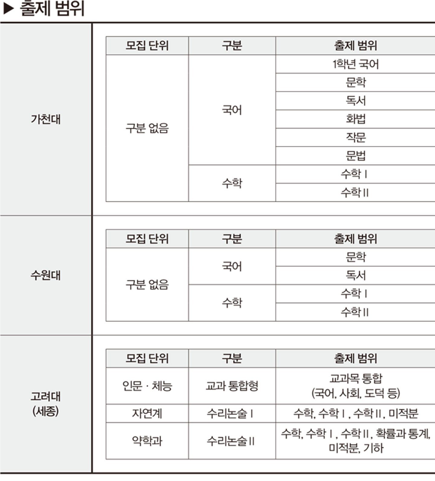 대학별 출제 범위를 살펴보면, 가천대는 모집 단위 구분 없이 국어와 수학에서 출제한다. 국어는 1학년 국어, 문학, 독서, 화법, 작문, 문법 영역을 출제한다. 수학은 수학Ⅰ, 수학Ⅱ에서 출제한다.