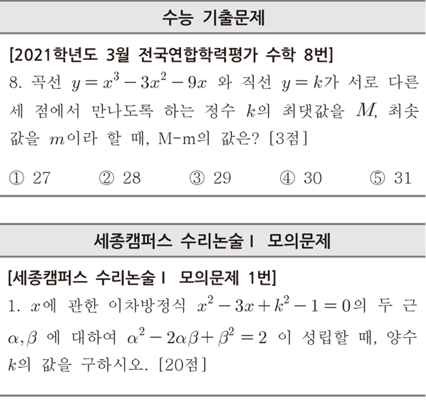 [수리논술Ⅰ] 고려대(세종) 수리논술Ⅰ의 경우, 수능의 3점짜리 문제 유형과 난도가 비슷하고, 수능 준비를 열심히 한 학생이라면 충분히 문제에 접근할 수 있다. 서론·본론·결론의 형식을 갖춰 서술하거나 복잡한 제시문 간의 관계를 추론해 서술하는 타 대학의 논술에 비해 준비 부담이 적다는 것이 대학 측의 설명이다. 그러나 난도에 따라 20~50점까지 문항별 배점을 달리했다. 수월하게 풀 수 있는 문항부터 상당 시간의 집중력을 요구하는 문항까지 출제될 것으로 예상된다. 전체 문항을 빠르게 검토한 뒤 자신 있는 문항부터 먼저 해결하는 전략이 필요하다.