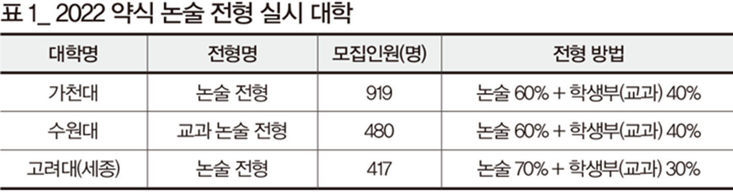 중위권 학생들이 수도권 소재 대학에 진학할 수 있는 기회를 제공하던 적성 전형이 수능과 비슷하다는 이유로 폐지됐다. 적성 전형을 실시하던 대학들은 2022학년 수시에서 기존의 모집 인원을 학생부 교과 전형이나 정시로 분산하는 한편, 가천대와 고려대(세종), 수원대는 단답형·약술형의 새로운 논술 전형을 신설했다. 이들 대학의 논술고사는 500~1천 자 분량의 답안을 쓰거나 고난도 유형의 수학이나 과학 문제를 풀어야 했던 기존의 논술고사와는 다른 것이 특징이다. 약식 논술 신설 대학의 전형 특징과 출제 문항 분석을 토대로 한 대비법을 알아보자.