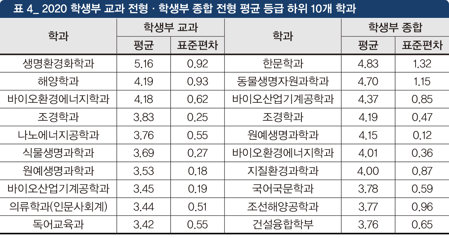 합격선은 예측이 불가능하지만 평균 등급이 4.5등급을 초과하는 학과도 있고(표 4), 추가 합격 후보 순위가 0번인 학과도 있다(표 5).