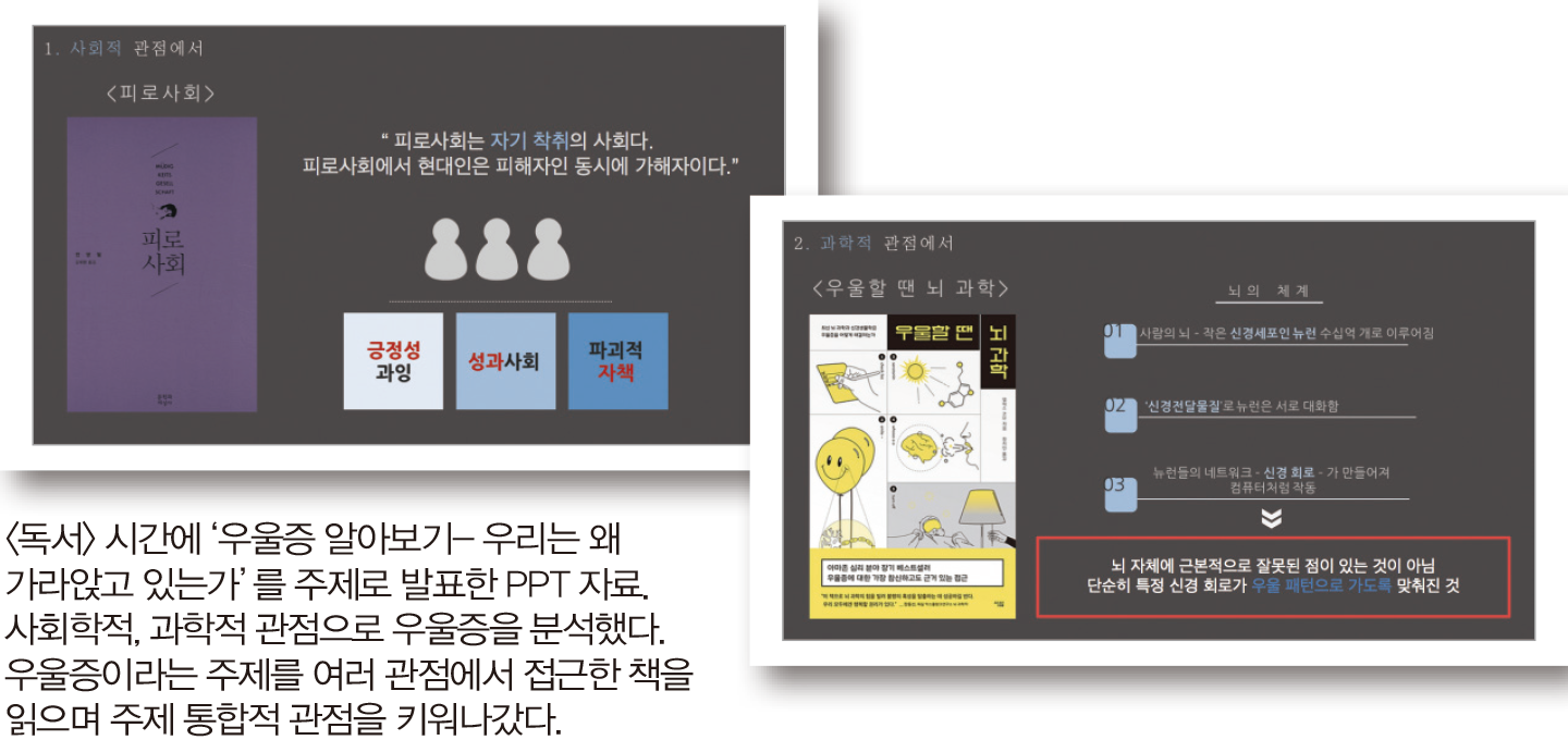 이 시기 하선씨는 <우울할 땐 뇌과학>이라는 책도 읽었다. <피로사회>가 우울증을 사회 구조, 사회학의 관점으로 설명했다면 <우울할 땐 뇌과학>은 우울증이 왜 생기는지, 우울증을 개선하기 위해서는 어떻게 해야 하는지 과학적으로 접근한 책이다. <피로사회>와 <우울할 땐 뇌과학>이 우울증이라는 주제를 전혀 다른 각도로 다루니 책을 읽는 내내 신선했다. <독서> 시간에 현대 사회에 우울증이 만연한 이유를 여러 책에서 찾았던 경험을 토대로 발표했다. 이는 <독서> 시간에 배웠던 주제 통합적 관점으로 이어졌다.