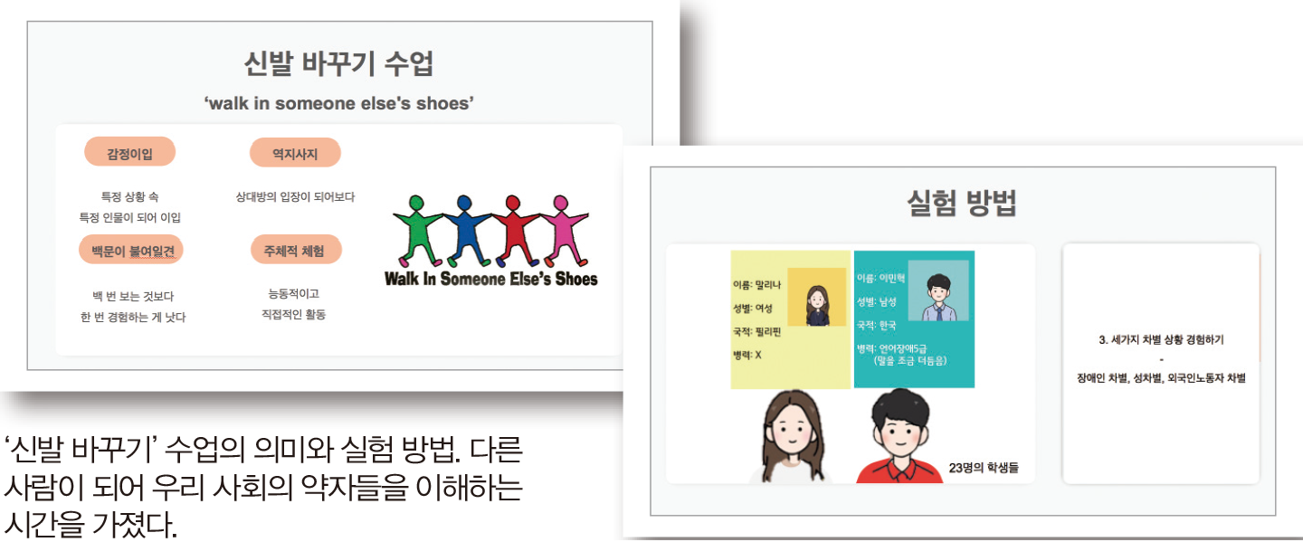 하선씨는 학교의 차별금지교육, 학교폭력예방교육도 가볍게 지나치지 않았다. 차별금지교육 이후 창의적 체험 활동 시간을 활용해 차별받은 타인을 이해하자는 취지의 수업 실험인 ‘신발 바꾸기’를 제안했다.