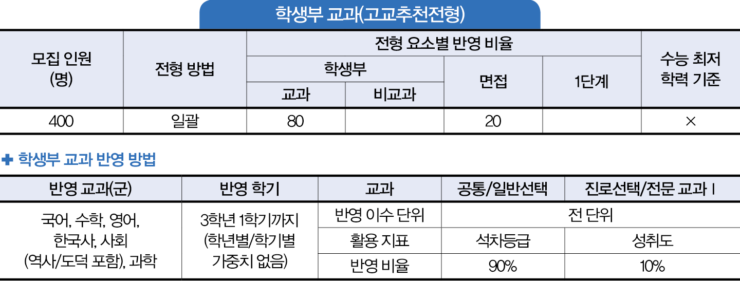 학생부 교과(고교추천전형)은 학생부 교과 80%와 면접 20%를 합산해 선발한다. 학생부 교과 성적 중 10%를 진로선택 과목과 전문 교과 I 과목의 성취도로 반영한다. 성취도에 따른 점수는 수시 모집 요강을 참조하기 바란다. 면접의 영향력은 평가 요소별 반영 비율에서 정한 20%라고 보면 된다. 다만 고교추천전형의 경우 학생부 교과 등급의 편차가 상대적으로 매우 작아서 면접에 의해 순위가 바뀔 가능성을 배제할 수 없다. 따라서 자신의 학생부 내용을 잘 숙지하고 관련 내용으로 면접을 준비한다면 합격 가능성을 높일 수 있다.