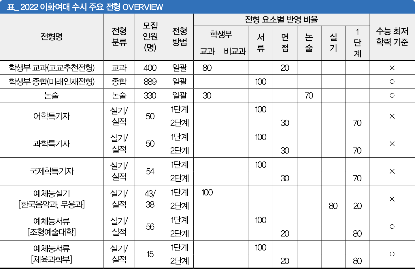 이화여대는 미래인재전형을 비롯해 고른 기회 전형, 사회기여자 전형 등 종합 전형에 최저 기준을 적용하고 교과 전형인 고교추천전형은 최저 기준을 적용하지 않는다. 종합 전형은 지원자의 학업 역량, 학교 활동의 우수성, 발전 가능성을 종합적으로 평가하는 만큼 고교에서의 석차등급이나 성취도 등 정량 정보를 평가에 직접적으로 활용하지 않는다. 따라서 대학 입학 후 수학 가능한 최소한의 학업적인 준비도를 평가하기 위해 최저 기준을 설정했다. 반면 고교추천전형의 경우 교육과정 안에서 충실하게 임한 학생들을 선발하는 전형이다. 따라서 그 취지를 반영해 별도의 최저 기준을 설정하지 않았다.