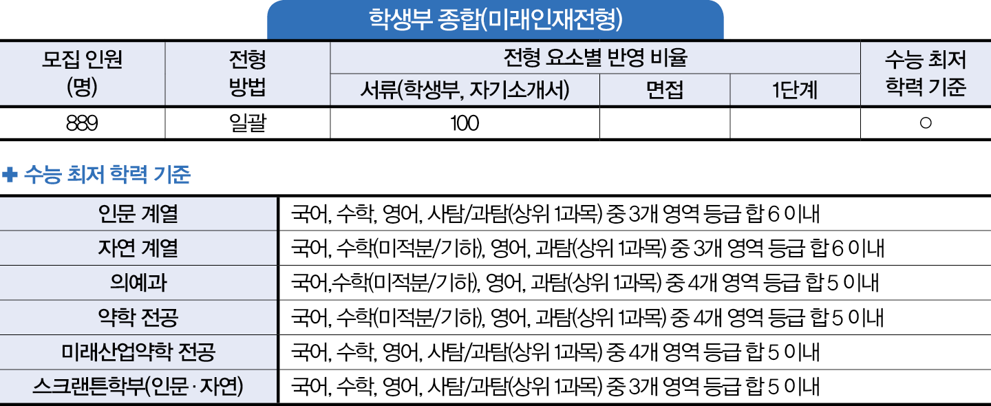 종합 전형인 미래인재전형은 최저 기준이 있는 반면, 교과 전형인 고교추천전형은 최저 기준을 적용하지 않는데?