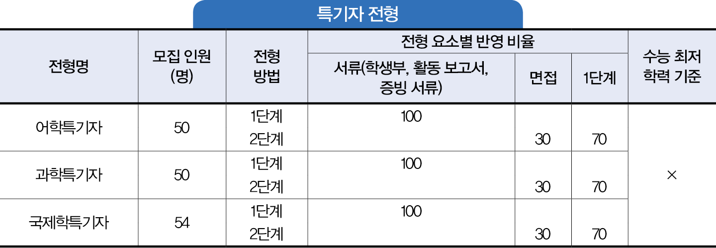 특기자 전형은 전형별 해당 분야에 강점이 있는 학생들을 선발하는 전형이다. 학생부와 자체 양식의 활동보고서를 토대로 평가를 진행한다. 1단계 서류 평가에서는 제출 서류를 토대로 지원자의 해당 분야 학업 역량 및 교내외 활동의 우수성, 발전 가능성 등을 종합적으로 평가하고, 2단계 면접을 통해 해당 분야에 대한 능력 및 발전 가능성 등을 종합적으로 심층 평가한다. 최저 기준이 없고, 면접은 제시문 없는 서류 기반 일반 면접이다. 단 국제학특기자 전형은 영어 강의 수강이 가능한 학생을 모집하고자 영어 면접을 진행한다.