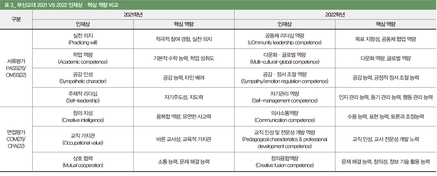 부산교대는 올해 인재상과 핵심 역량에 전년 대비 변화가 있다(표 3). 학생부에 해당 인재상과 핵심 역량이 잘 기록되어 있다면 적극적으로 지원을 고려해볼 수 있다.