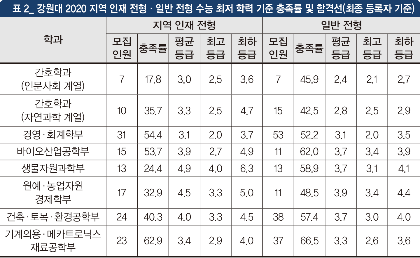강원권 학생들의 경우 일반 전형과 지역 인재 전형 지원에 혼란을 겪는 경우가 많다. 지난해 일부 학과의 일반 전형과 지역 인재 전형의 합격 등급 및 최저 기준 충족률을 살펴보면 다음과 같다(표 2).