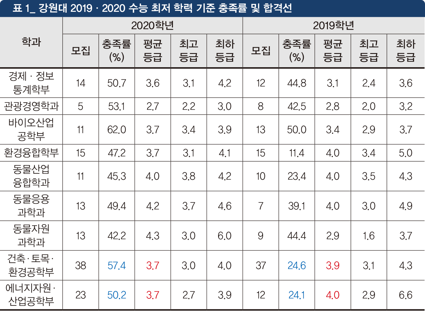 교과 전형의 경우 수능 최저 기준의 변화가 없다. 하지만 상대적으로 재학생 수 감소, 재수생 증가 요인을 고려한다면 최저 기준 충족이 지난해에 비해 어려울 수 있다. 2020학년, 2019학년 강원대 일부 학과의 최저 기준 충족률을 통해 본 합격자 결과를 살펴보면 다음과 같다(표 1, 일반 전형, 최종 등록자 기준).