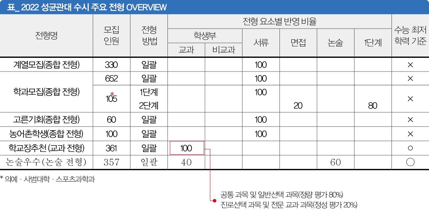 2022학년 성균관대 수시는 여러 변화가 있다. 2021학년 31.6%였던 정시 전형이 40.1%로 확대되면서 학생부 종합 전형과 논술 전형의 모집 인원이 감소했다. 특히 2021학년에 전체 모집 인원의 50.6%인 1천803명을 선발했던 종합 전형이 37.1%인 1천340명으로, 논술 전형 역시 14.9%에서 9.9%로 감소했다. 반면 학생부 교과 전형인 학교장추천이 신설돼 모집 인원의 10%인 361명을 선발한다. 성균관대 학교장추천 전형은 고3 재학생만 지원할 수 있다는 특징이 있다. 올해 학부 선발하는 약학 대학도 2022 수시의 변화로 꼽을 수 있다. 성균관대는 수시 모집 모든 전형 간 중복 지원이 가능하지만, 같은 전형 내에서 서로 다른 모집 단위의 중복 지원은 불가능하다. 2022학년 성균관대 수시 전형 지원 시 주목할 점을 성균관대 입학처 권영신 입학사정관 실장에게 들었다.