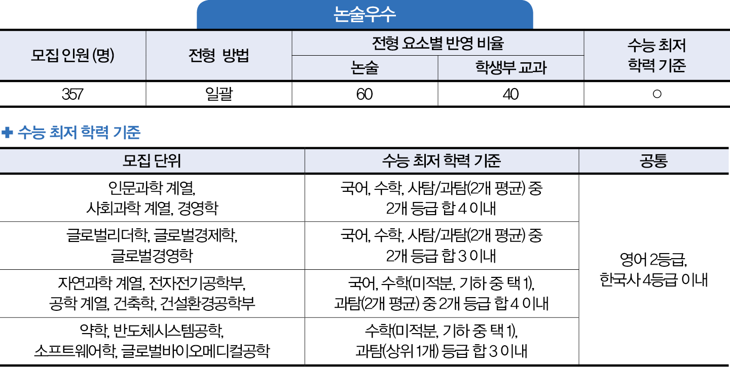 2021학년 논술 전형은 학생부 40%(교과 30%+비교과 10%)+논술 60%이였다. 2022학년에는 비교과 10%를 폐지하고 교과를 40% 반영한다. 2023학년에는 전형에 집중하고자 논술 100%로 변경할 예정이다. 자연 계열은 수학 2문제와 과학 1문제가 출제된다. 과학 문제는 <물리학Ⅰ> <화학Ⅰ> <생명과학Ⅰ>에서 출제되며, 시험 당일 문제지 수령 후 선택할 수 있다. 최저 기준도 눈여겨봐야 한다. 글로벌리더학과, 글로벌경제학과, 글로벌경영학과, 약학과, 소프트웨어학과, 반도체시스템공학과, 글로벌바이오메디컬공학과는 최저 기준을 별도 설정했다. 참고로 인문 계열 전공 지원자는 최저 기준에서 제2외국어/한문을 탐구 영역 1개 과목으로 대체할 수 있다.