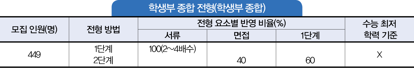 지원 자격은 고교 졸업(예정)자로 ‘모집 단위별 인재상에 부합한다고 자기 자신을 추천할 수 있는 자’다. 1단계에서 서류 평가를 통해 모집 인원의 2~4배수를 2단계 면접 평가 대상자로 선발하며, 1단계 서류 평가 60%와 면접 40%를 합산해 최종 합격자를 선발한다. 1단계 서류 평가에서는 학업 역량 35%, 잠재 역량 40%, 사회 역량 25%로 평가한다.