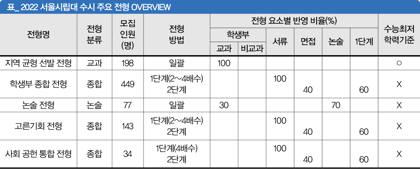 서울시립대 2022학년 수시 모집은 기존 틀과 유사하나 세부 전형 방식에 약간씩 변화가 있다. 기존 학생부 교과 전형은 학교장 추천을 받는 지역 균형 선발 전형으로 변경했고, 지원자층이 유사한 대학들 중 유일하게 진로선택 과목을 반영하지 않는다. 논술 전형은 인문 계열 모집을 폐지했다. 학생부 종합 전형, 논술 전형은 전형 요소별 반영 비율이 조금씩 바뀌었다. 지난해 전형 결과는 홈페이지에 공개한 상태다. 공립대학으로서 투명한 정보 공개를 통해 대입 전형에 대한 사회적 신뢰를 제고하려 한 것이라는 설명이다. 올해 서울시립대 수시 모집 전형에 대해 장한별 선임입학사정관과 함께 살펴봤다.