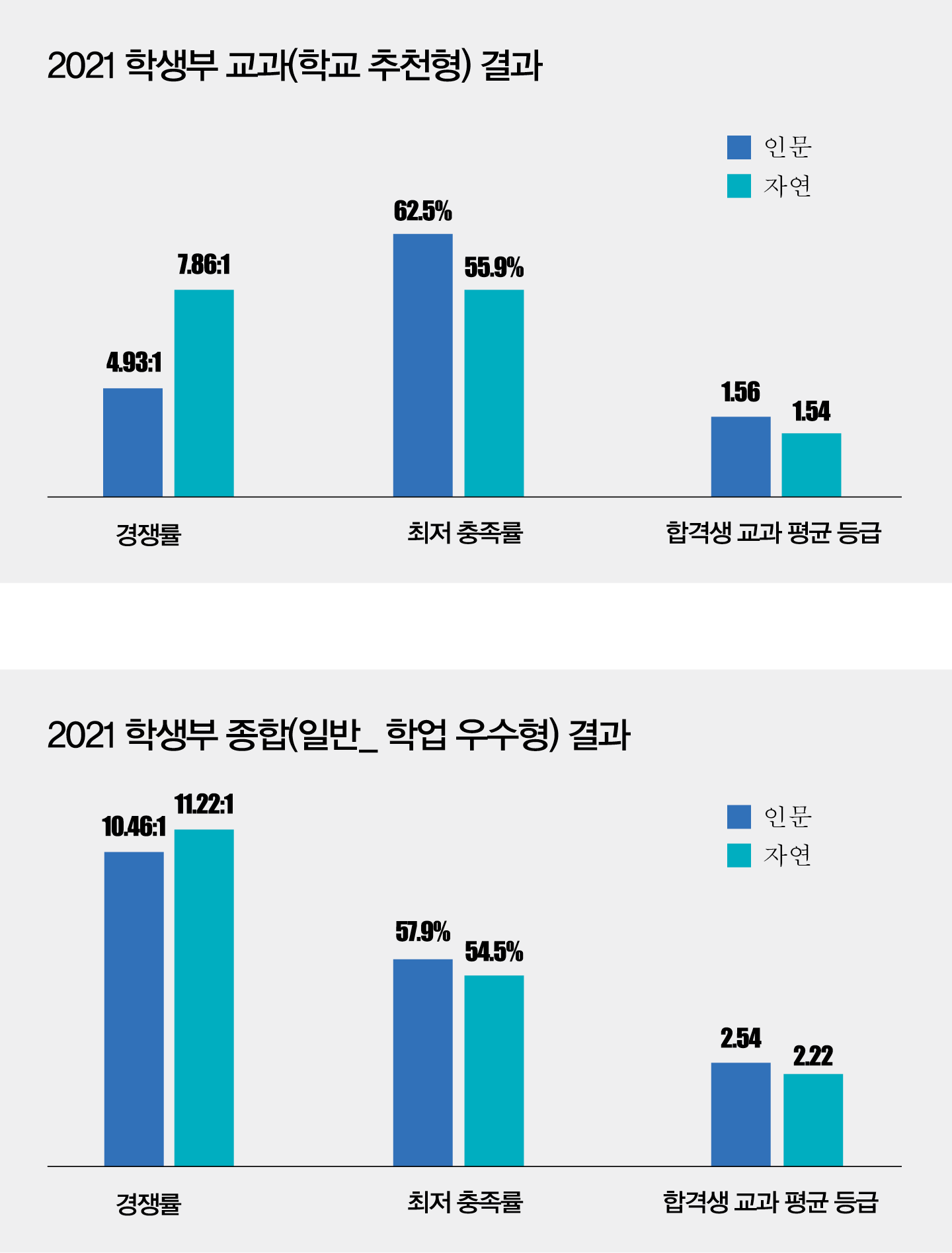 최저 기준 조정을 고려하고 있지 않다. 지난해 수시에서 최저 기준이 있었던 학교 추천형과 학업 우수형의 충족률은 인문 계열 60.2%, 자연 계열은 55.3%로 집계됐다. 다만 2023학년 학교 추천 전형의 최저 기준을 4개 영역 등급 합 기준 1등급씩 낮췄다.