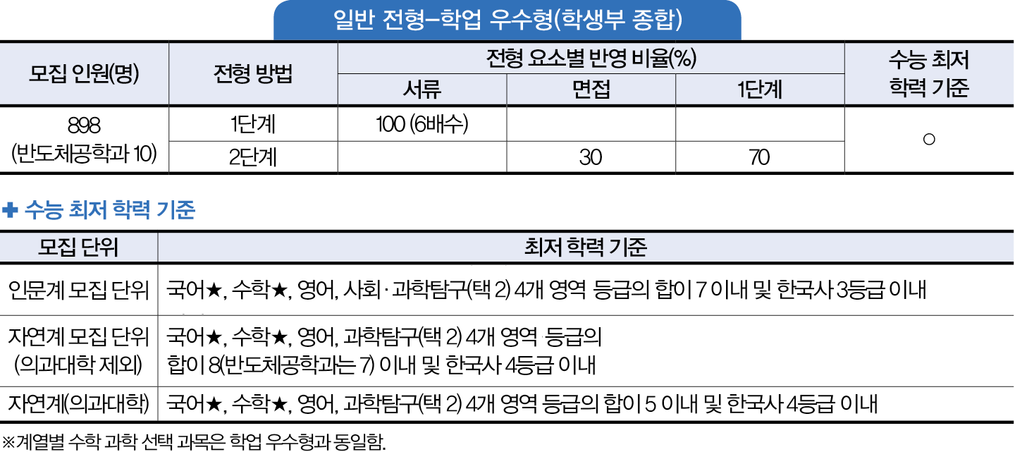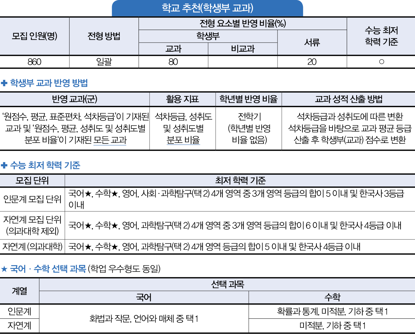 서류 평가에서는 자기계발 역량 70%와 인성 30%를 반영한다. 수능 최저 학력 기준은 작년과 동일하지만, 자연 계열 모집 단위의 수학 선택 과목이 <미적분>과 <기하>로 지정됐다. 수능 응시 인원의 감소 추세, 수능 체제의 변화 등을 감안하면 충족이 쉽지 않다. 수능에 자신 있다면 적극 도전해볼 만하다. 서울대 지역 균형 선발 전형, 연세대 추천형, 성균관대 학교장 추천 전형, 서강대 고교장 추천 전형 등과 지원자 풀이 겹칠 수 있다.