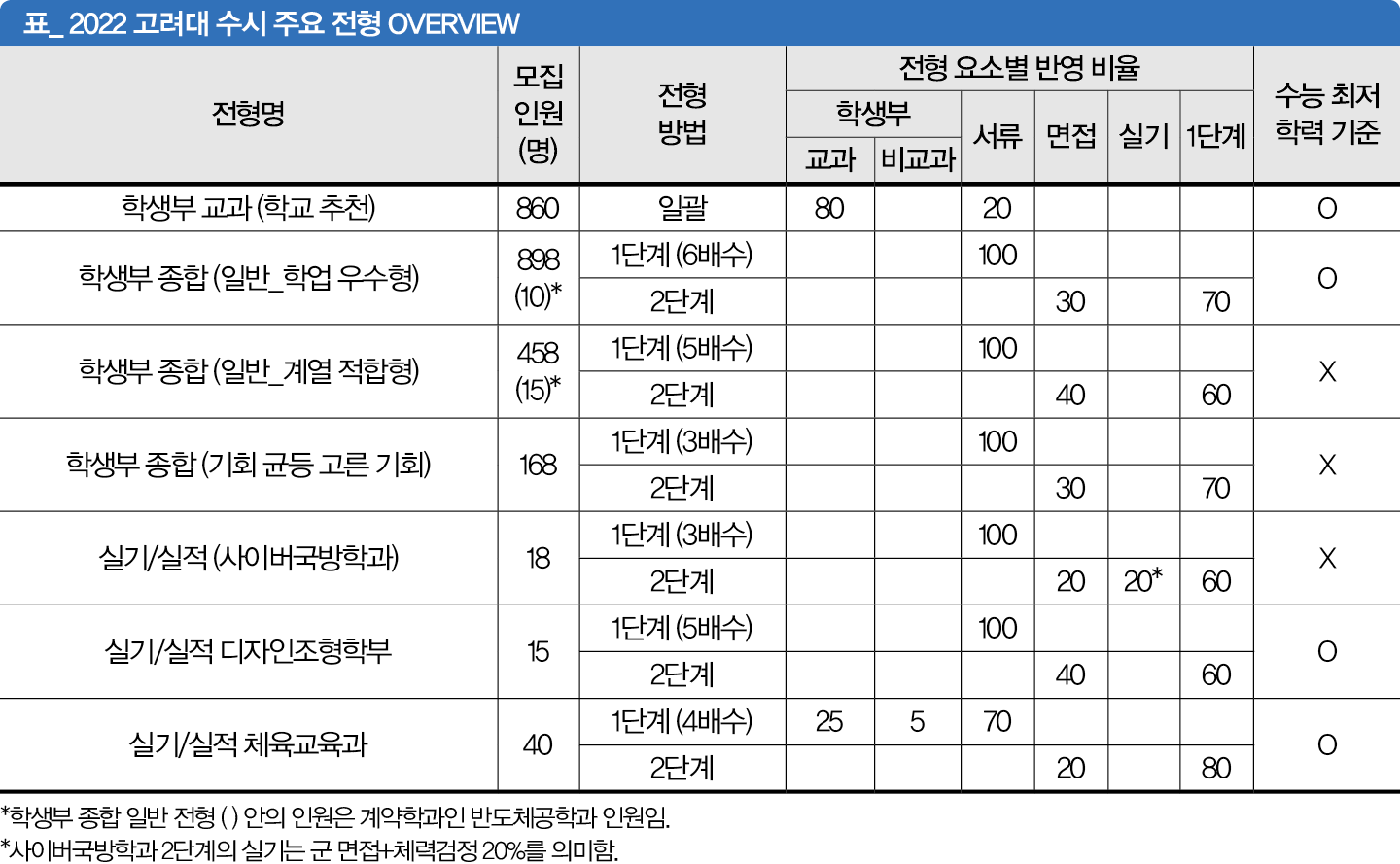 또 고려대는 학교 추천 전형에서도 서류 평가를 20% 반영한다. 이를 통해 공동 교육과정 이수 등 지원자의 추가적인 노력을 고려하므로 충분히 보완할 수 있을 것이다.