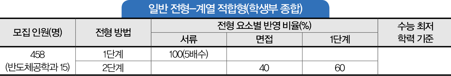 일반고 학생의 합격 비중이 높았다. 반도체공학과·융합에너지공학과·데이터과학과·스마트보호학부에 최종 등록한 일반고(자공고 포함) 출신 합격자 비율이 각각 60% 이상을 차지했다. 합격생들은 학교생활에 충실했다는 공통점이 있다. <물리학> <화학>은 Ⅱ과목 이상 이수했으며, 수학·과학 관련 동아리·대회 참여 및 수상 실적도 풍부했다. 교과 성적이 우수하고, 관련 역량이 뛰어나면 적극적으로 지원해보길 권한다.