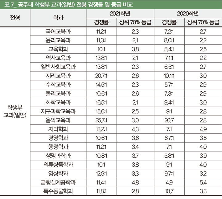 2021학년 학생부 교과(일반) 전형에서는 경쟁률에서 사범대가 강세를 보이고 있다. 공주대 사범대학이 임용고시에서 전국적으로 높은 합격률을 유지하는 데다 교직에 뜻을 품은 학생이 사범대로 소신 지원한 영향이 컸을 것이다. 2021학년에 전년 대비 상위 70% 등급이 올라간 것은 경쟁률이 높아진 이유도 있겠지만, 수능 최저 기준이 완화된 결과도 한몫한다. 학생부 교과(일반) 전형은 학생부 100(교과 90+출결 10)으로 선발하지만, 사범대학은 학생부 80+면접 20이며, 음악교육과는 학생부 60+면접 10+실기 30이다.