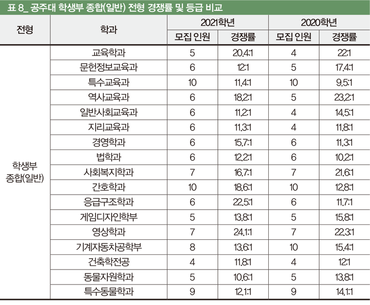 2021학년 학생부 교과(일반) 전형에서는 경쟁률에서 사범대가 강세를 보이고 있다. 공주대 사범대학이 임용고시에서 전국적으로 높은 합격률을 유지하는 데다 교직에 뜻을 품은 학생이 사범대로 소신 지원한 영향이 컸을 것이다. 2021학년에 전년 대비 상위 70% 등급이 올라간 것은 경쟁률이 높아진 이유도 있겠지만, 수능 최저 기준이 완화된 결과도 한몫한다. 학생부 교과(일반) 전형은 학생부 100(교과 90+출결 10)으로 선발하지만, 사범대학은 학생부 80+면접 20이며, 음악교육과는 학생부 60+면접 10+실기 30이다.