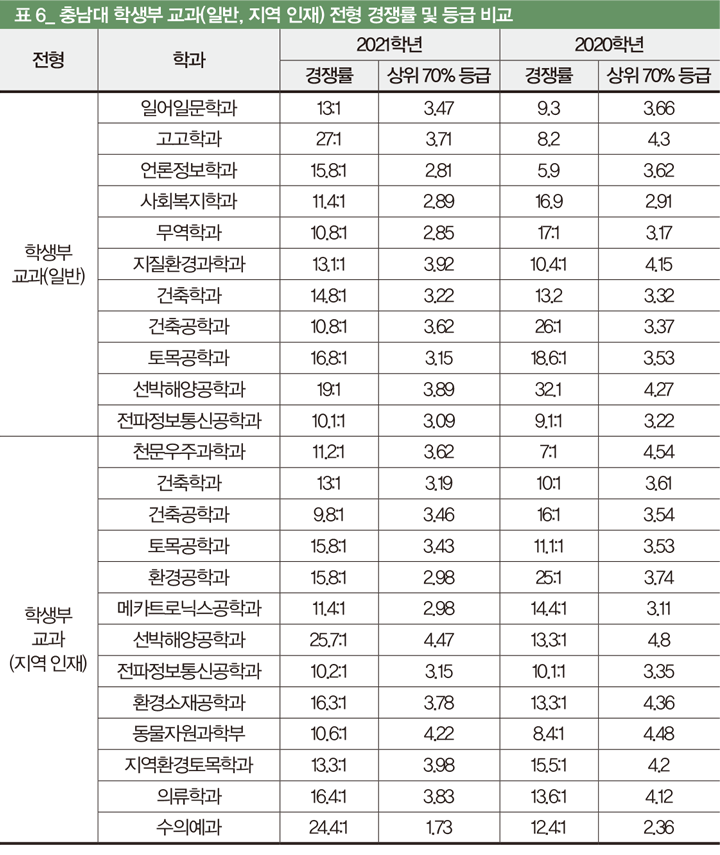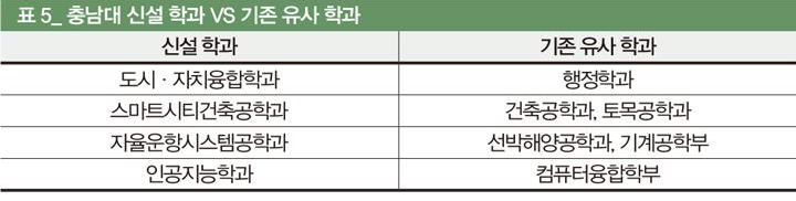 올해 충남대에서는 약학과, 국제학부, 도시·자치융합학과를 신설하고, 교육부로부터 4개 첨단 학과(스마트시티건축공학과, 자율운항시스템공학과, 인공지능학과, 생명정보융합학과)를 승인받았다. 4개 학과에서 총 136명의 학생을 선발한다. 특히 신설 학과는 기존 학과와 성격이 겹칠뿐 아니라 관련 정보가 부족해 학과 수준에 비해 다소 낮게 형성되는 경향도 있어 관심을 가져볼만하다(표 5).