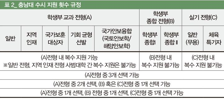 또 예년과 마찬가지로 수시에서 최대 3회까지 지원 가능하다(표 2). 단 사범대학의 경우 면접일이 겹칠 수 있어 일반 전형과 지역 인재 전형 간 복수 지원이 불가능하다. 수능 최저 학력 기준은 일부 모집 단위에서 지난해보다 완화됐다(표 3·4).