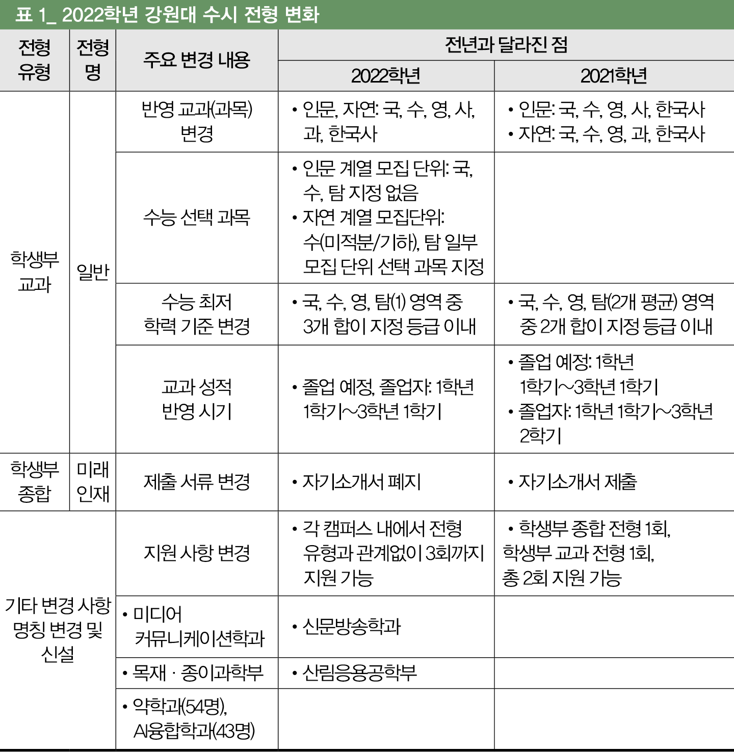 2022학년 강원대 수시 전형에는 일부 변화가 있다. 우선 약학과 모집 인원이 신설돼 상위권 학생들의 지원 패턴 변화가 예상된다. 계열별로 달랐던 반영 교과가 올해는 구분 없이 적용되며, 교과 성적 반영 시기도 졸업 여부와 상관없이 동일하게 적용된다.