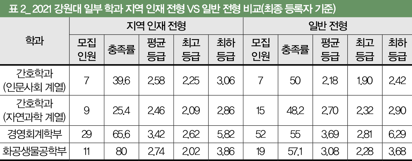 강원권 학생들은 지난해까지 일반 전형과 지역 인재 전형을 놓고 어느 전형으로 지원하는 것이 좋은지 혼란스러워하는 경우가 많았다. 지난해 일부 학과의 일반 전형과 지역 인재 전형 간 합격 등급과 최저 기준 충족률을 살펴보자.