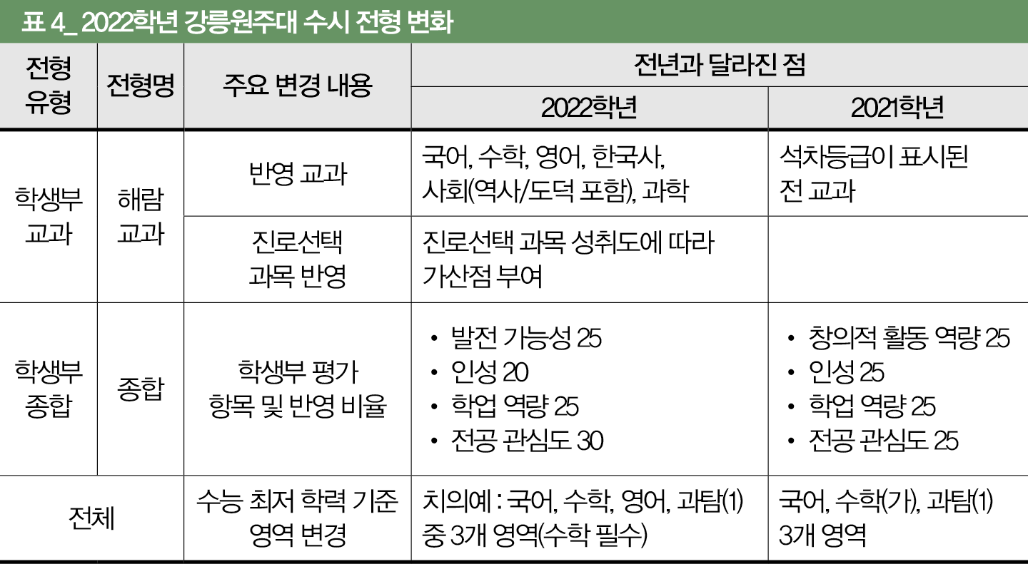 강릉원주대의 2022학년 수시 모집에서는 반영 교과가 석차등급이 표시된 전 교과에서 국, 수, 영, 사, 과, 한국사로 변화했다. 또 성취도가 반영되는 진로선택 과목의 경우 성취도에 따른 가산점이 부여된다. 학생부 종합 전형의 평가 항목과 비율이 일부 달라졌다는 점도 지원 시 고려해야 할 요소다. 치의예과의 수능 최저 학력 기준 중 영어가 반영되고 수학이 필수 반영으로 변화했다.