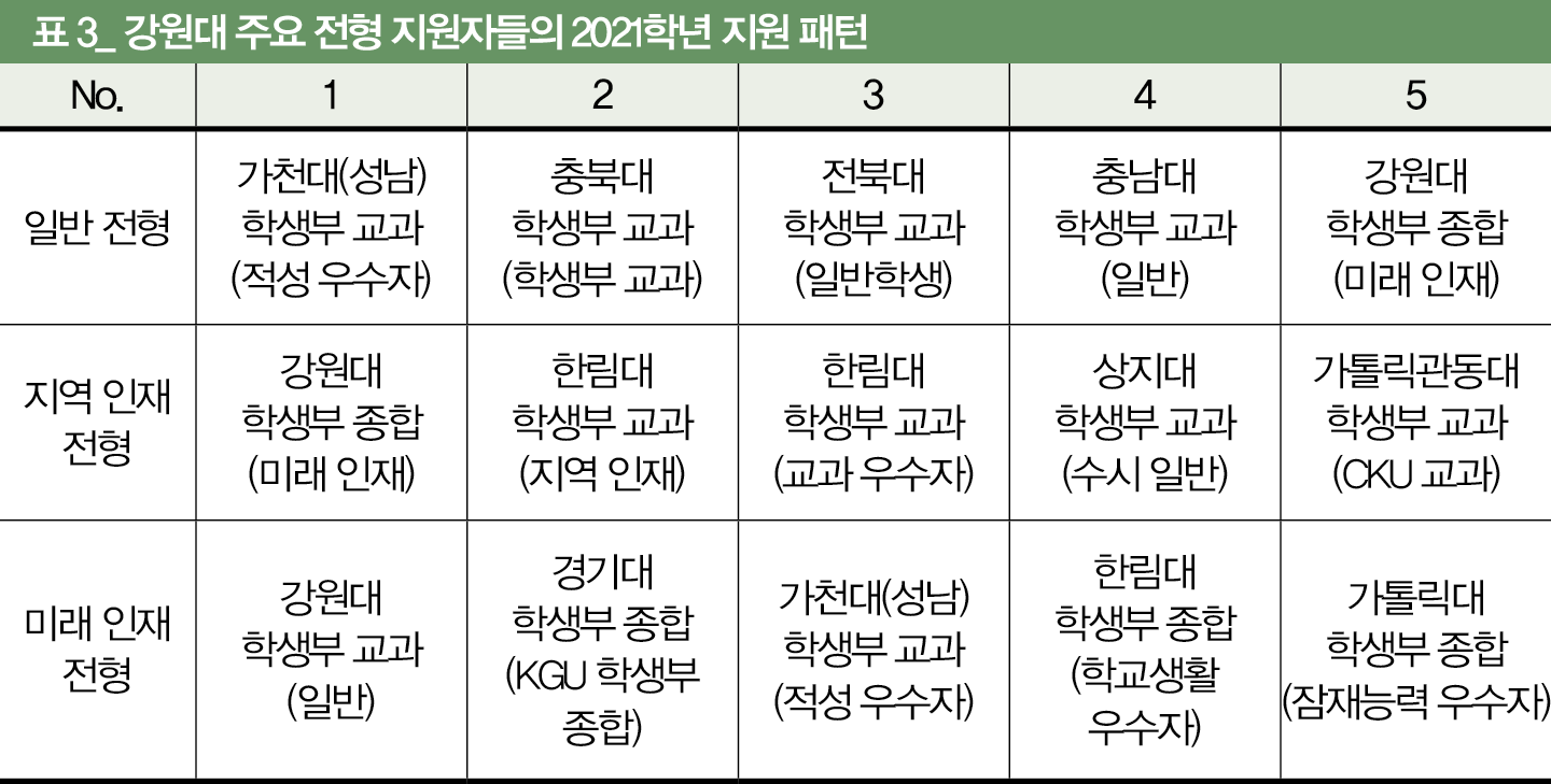 강원대에 지원하는 학생들의 지원 패턴은 매우 다양하다. 2021학년 강원대 주요 전형 지원자들의 지원 패턴을 살펴보자.