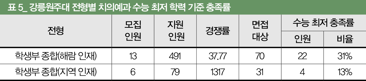 수능 최저 학력 기준에도 변화가 있다. 올해 수능 체제가 바뀌면서 학과별 지정 영역이 달라졌고, 지난해 2개 영역 반영에서 올해 3개 영역 반영으로 변화했다. 탐구 영역은 상위 1과목 반영으로 변경됐다. 일반 전형에 비해 지역 인재 전형의 최저 기준이 완화됐기 때문에 강원 지역 학생들의 지역 인재 전형 지원율도 증가할 것으로 보인다. 다만 인문 계열 학과의 경우 올해 수학 통합 산출로 최저 기준 충족이 다소 어려워졌다는 점을 고려하면 학교별 선택 과목 증가 등과 맞물려 교과 합격선은 지난해보다 하락할 가능성이 높아졌다.