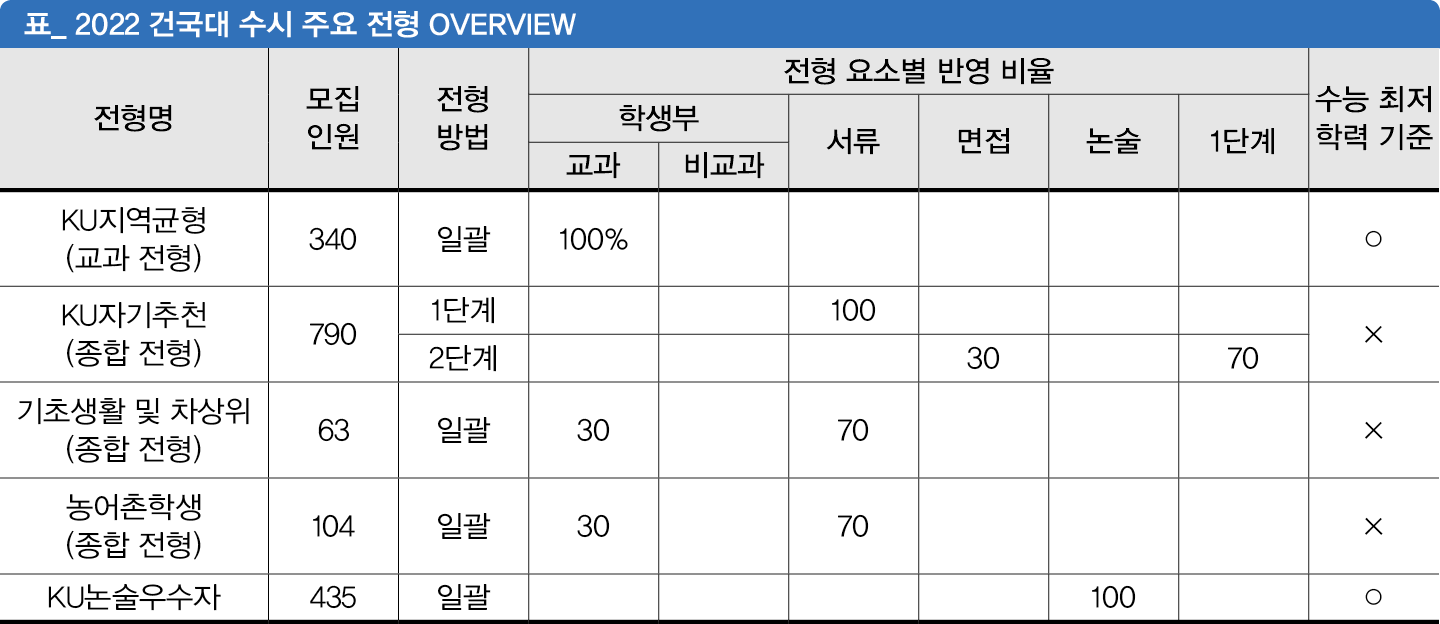 고민이 많았던 전형이다. 건국대는 2021학년까지 KU학교추천과 KU자기추천 모두 종합 전형으로 운영하고 있었는데 대입 공정성이 화두로 부상하면서 대책의 초점이 정시와 교과 전형의 확대에 맞춰졌다. 고교별 학생들의 역량이 다른 상황에서 등급만으로 100% 선발하는 것에 대한 고민이 많았기에 보완책으로 최저 기준을 설정한 것이다. 참고로 진로선택 과목은 상위 3과목을 반영하며 A 10점, B 9.9점, C 8점으로 산출한다. 2023학년에는 KU지역균형의 전형 요소가 학생부 교과 70%와 서류 30%로 변경되고, 최저 기준도 폐지된다. 또한 진로선택 과목은 학생부 교과(정량 평가)에서 제외되고, 서류 평가(정성 평가)에서만 반영한다.