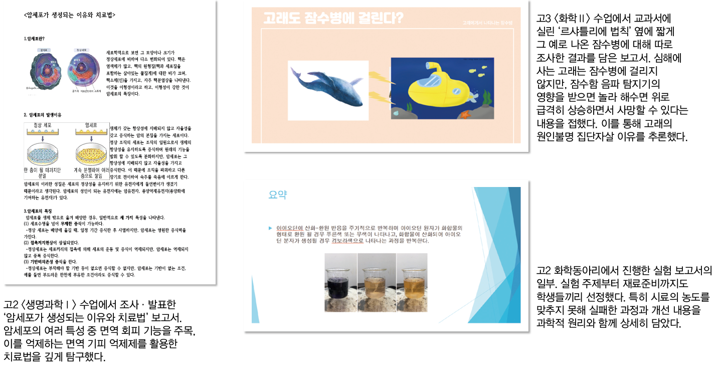 유정씨의 꿈은 하나가 아니었다. <생명과학>만큼 좋아했던 <화학>을 파고들면서, 또 하나의 길을 찾았다. 시작은 고2 때 활동한 화학 동아리에서의 다양한 실험이었다. 주제를 결정하고 교과서, 유튜브, 논문 등을 다양하게 조사해 실험을 설계한 후, 실험 과정을 기록하고 결과를 분석해 보고서로 남기기까지 모든 과정을 학생들끼리 진행했다.
