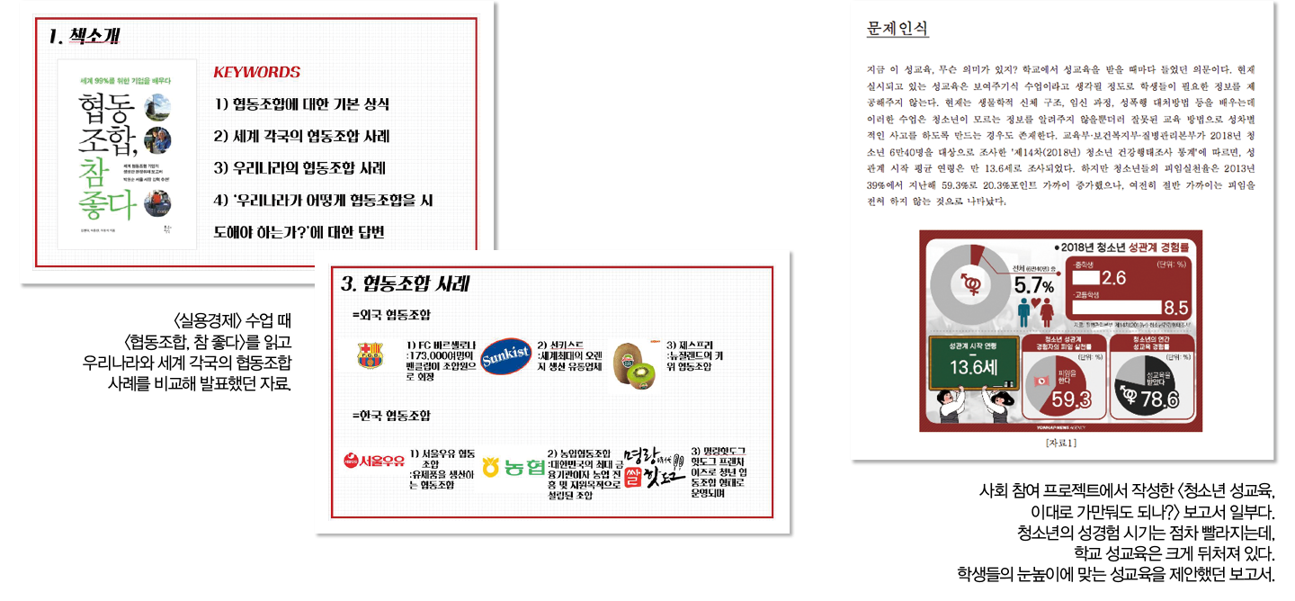 이런 경험을 토대로 협동조합의 개념, 긍정적 측면, 외국과 우리나라의 상황, 개선점 등을 정리해 <실용경제> 시간에 발표했다. 협동조합과 크라우드 펀딩을 결합해 역사 캠페인으로 구체화했던 경험은 학생부에 창업 모델을 고민했던 흔적으로 기재됐다.