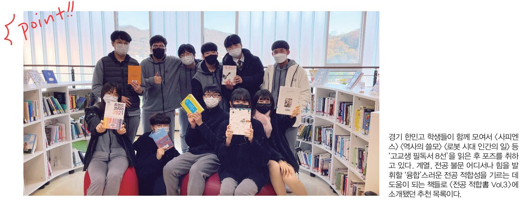 경기 한민고 김형중 교감은 “도서관의 자료를 구입할 때 <내일교육>에서 발행하는 ‘전공 적합 書 ’ 시리즈를 참고한다. 도서 구입 후 전공별 추천 책, <전공 적합 書 Vol.3>에 소개됐던 고교생 필독서 8선 등을 주제로 북 큐레 이션을 진행한 바 있다. 같은 주제에 관심이 있는 학생들이 함께 모여서 책 을 읽고, 이야기 나누는 시간을 갖게 한다”고 설명했다.