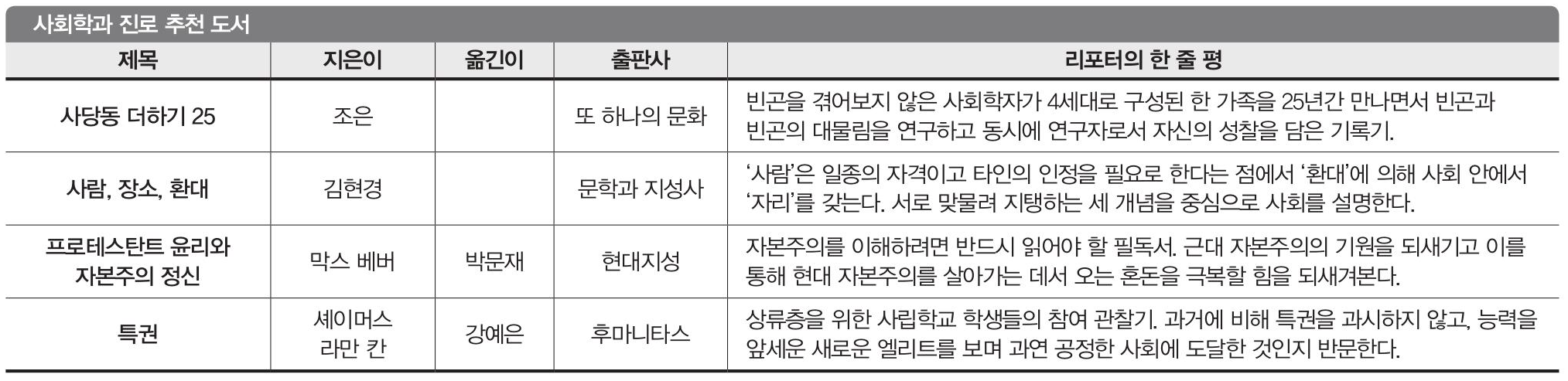 “중학생 때 읽었는데 사회학에 흥미를 갖게 해줬어요. 각 개인이 모여서 만드는 사회, 그리고 사회 구조를 만드는 힘에 대한 궁금증을 인류의 역사 및 고전 학자들의 이론을 가지고 풀어주는 책인데요. 덕분에 프랑스혁명 이후로 혼란해진 시대에 질서와 안정을 꿈꾸던 콩트가 사회학을 창시함으로써 사회학이 태동했음을 알게 됐어요. 이 책은 사회 실재론, 사회 명목론과 같은 사회를 바라보는 관점들을 소개해주고, 모두가 함께 살아가는 사회를 만들기 위한 시민들의 감시와 협력, 연대의 중요성에 대해서도 짚어줘요. 알기 쉽게 설명해주고 고교 <사회·문화> 수업과도 연결되는 내용이 많아 도움이 됐어요.”_ 정지연