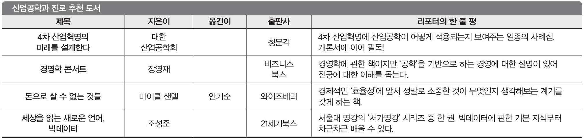 산업공학을 공부하려면 경제의 흐름, 사회의 변화, 첨단 기술의 발달, 인간관계 등에 대한 폭넓은 이해가 필요한 만큼 여러 분야를 아우르는 융합적인 독서로 전공 역량을 업그레이드해보자.